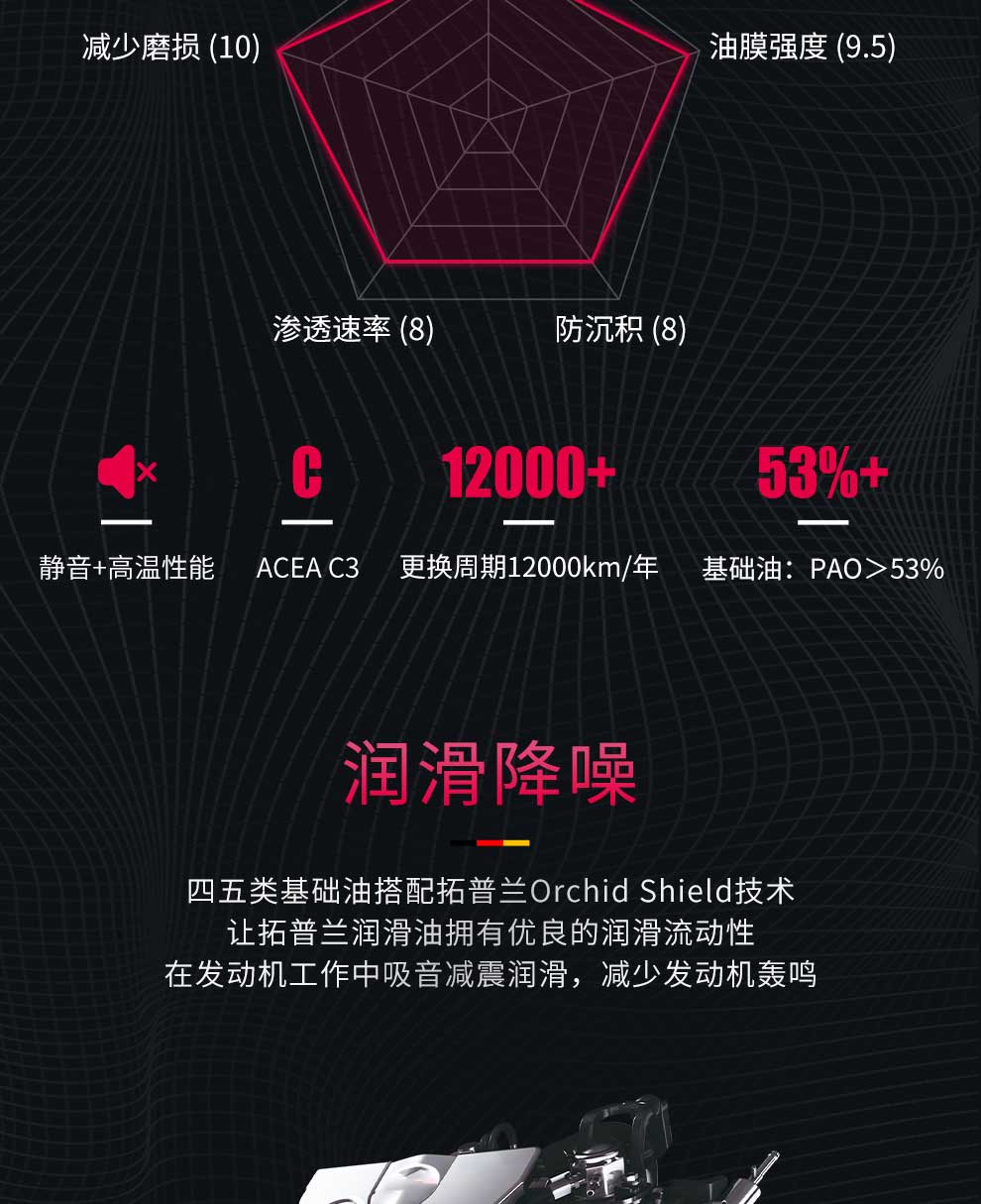 TUOPULAN智越系列满足严苛的技术要求,提供优异的冷启动保护,即使在高温下,也会迅速的在发动机关键的零件上形成一层连贯的油膜,保持对发动机最佳的抗磨损保护。