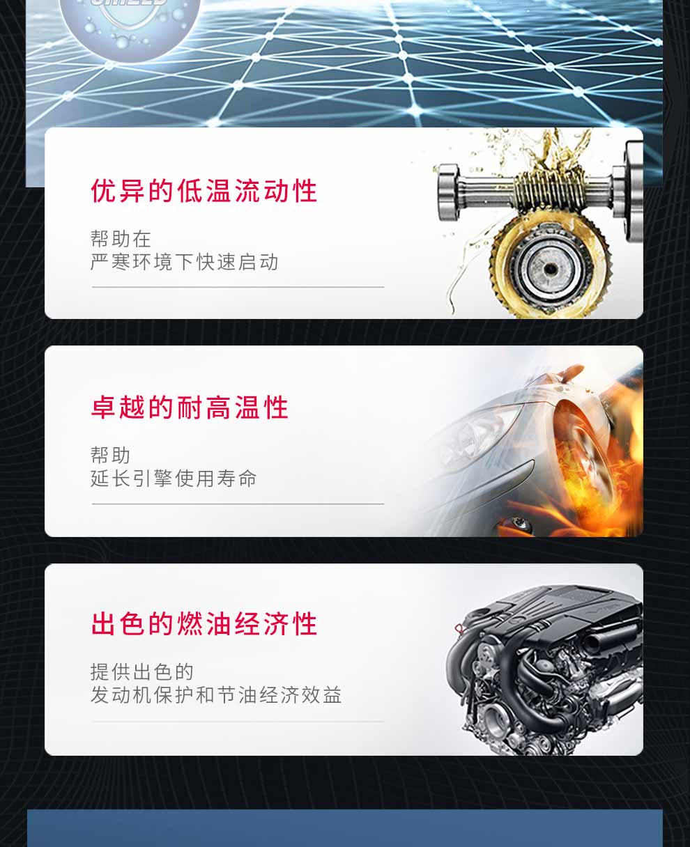 低粘度,先进的全合成配方有助于提高发动机效率并改善燃油经济性,同时提供出色的整体发动机保护。