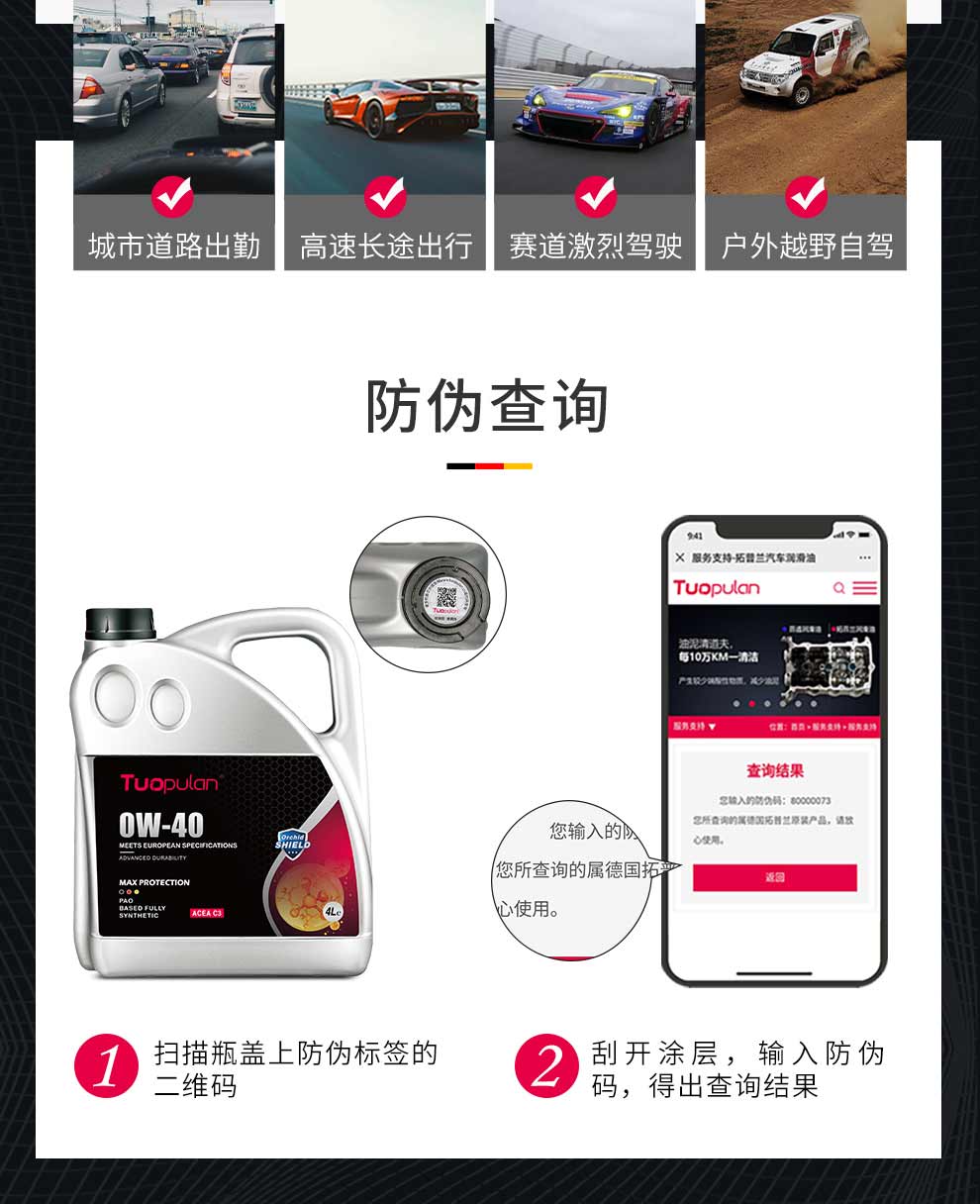 TUOPULAN智越系列满足严苛的技术要求,提供优异的冷启动保护,即使在高温下,也会迅速的在发动机关键的零件上形成一层连贯的油膜,保持对发动机最佳的抗磨损保护。